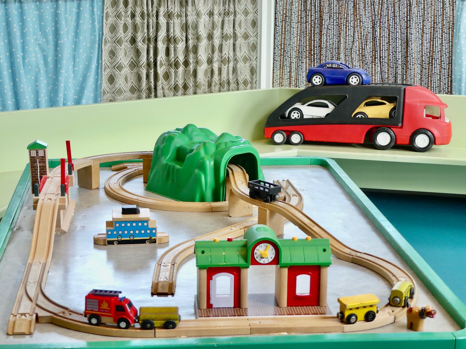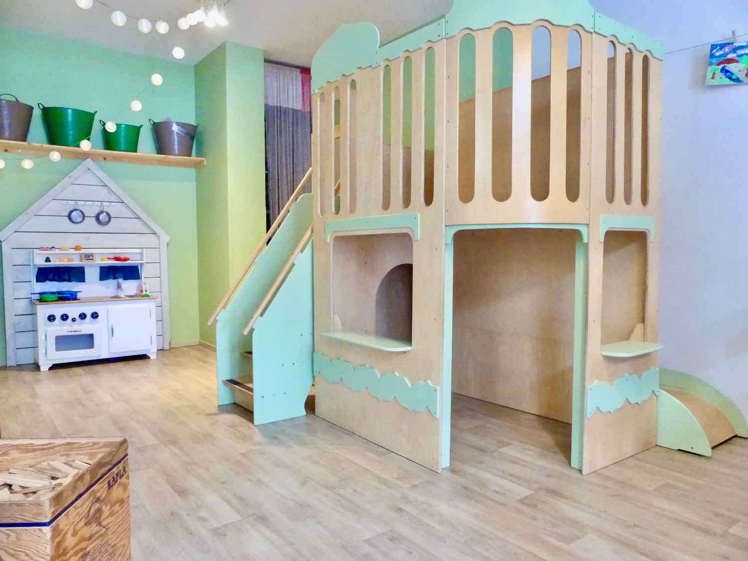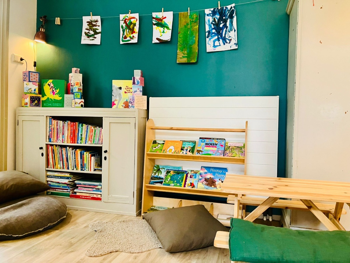 Er zijn verschillende speelhoeken zoals een blokkenhoek met een treintafel en auto’s, een poppenhoek met poppen en knuffels, een huisje met keukentje waar de kleintjes in potjes en pannetjes kunnen roeren. Ook is er een boekenhoek met zitkussens om samen met je kind een boekje te lezen.