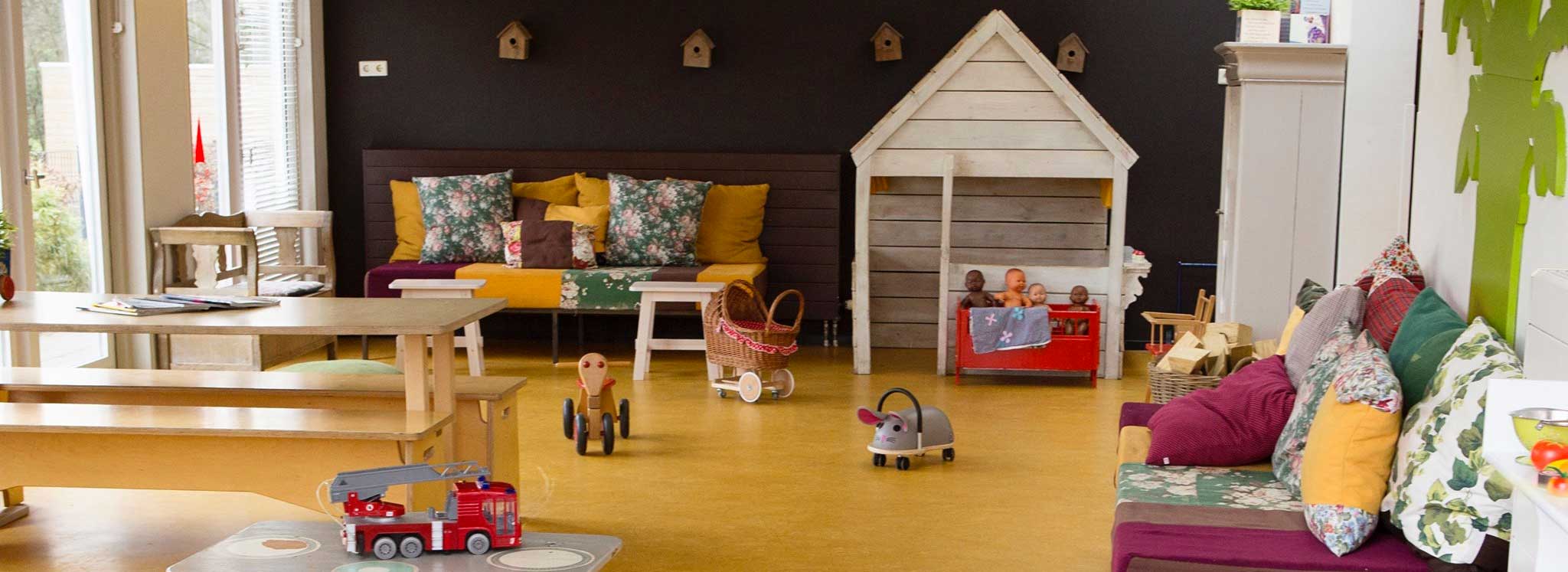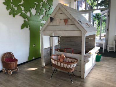 Inside there are many different play corners such as: a block building corner, a train table, a corner with dolls and a play kitchen where children can stir in pots and pans.